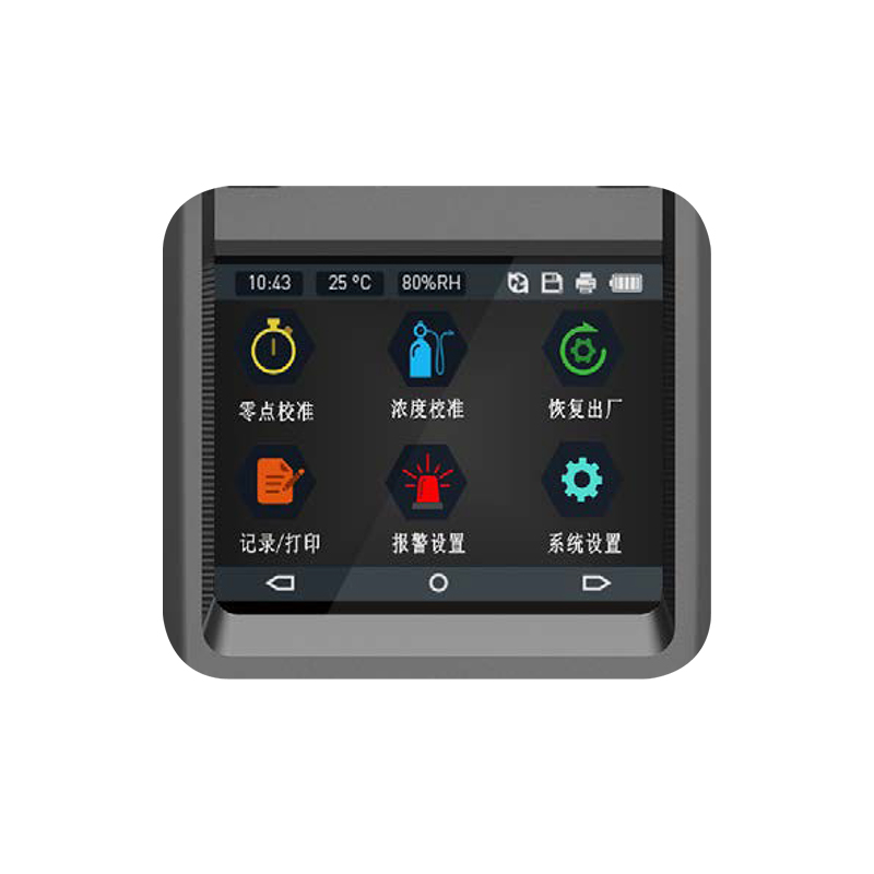●2.5寸高清彩屏顯示實(shí)時(shí)濃度、報(bào)警、時(shí)間、溫度、濕度、存儲(chǔ)、通信、打印、
